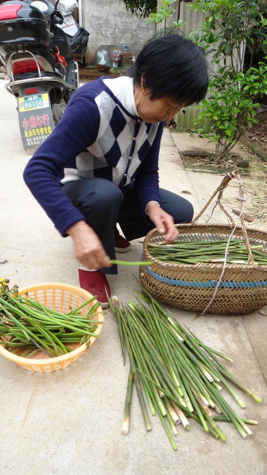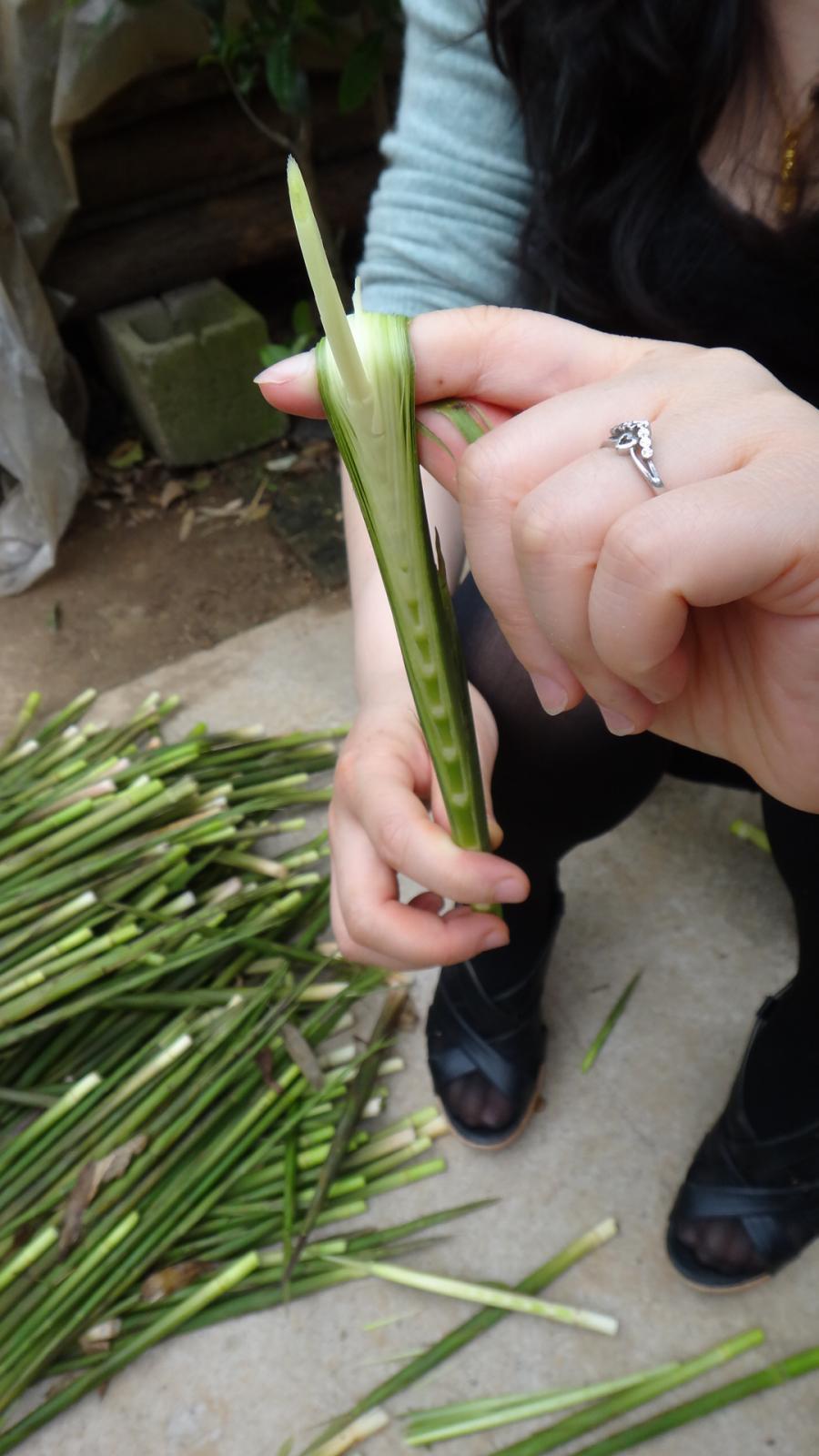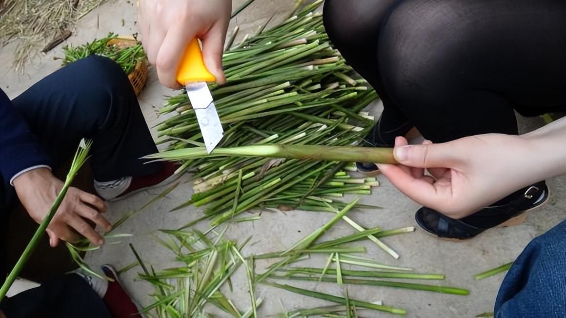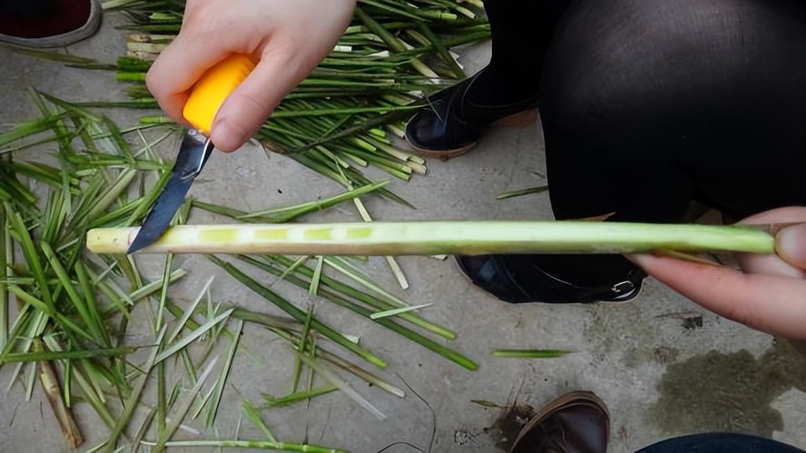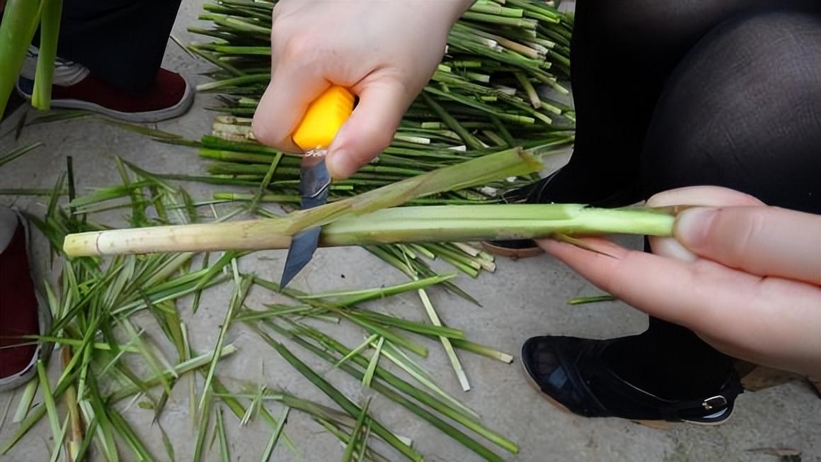 六.右手拿着笋,左手食指卷着笋尖剩下的笋衣。
