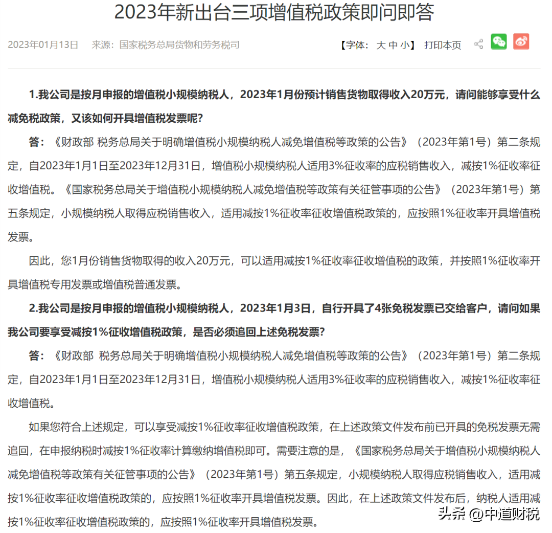 那么对于2023年1月初的过渡期,在新政出台之前,已经开具了免税发票或者3%征收率的发票,应该如何处理呢?对于这个问题,总局在1月13日“2023年新出台三项增值税政策即问即答”中已经做了明确的说明,具体如下: