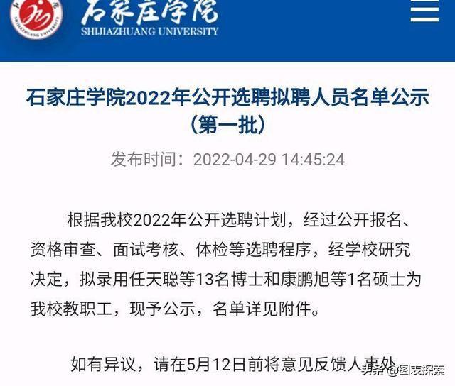五一假期前夕,石家庄学院公布了2022年度拟选聘13位博士的名单,公示时间是两周,公示日期截止到5月12日。但是这份名单公布之后却引起了质疑,很多网友认为是“水博”,那么