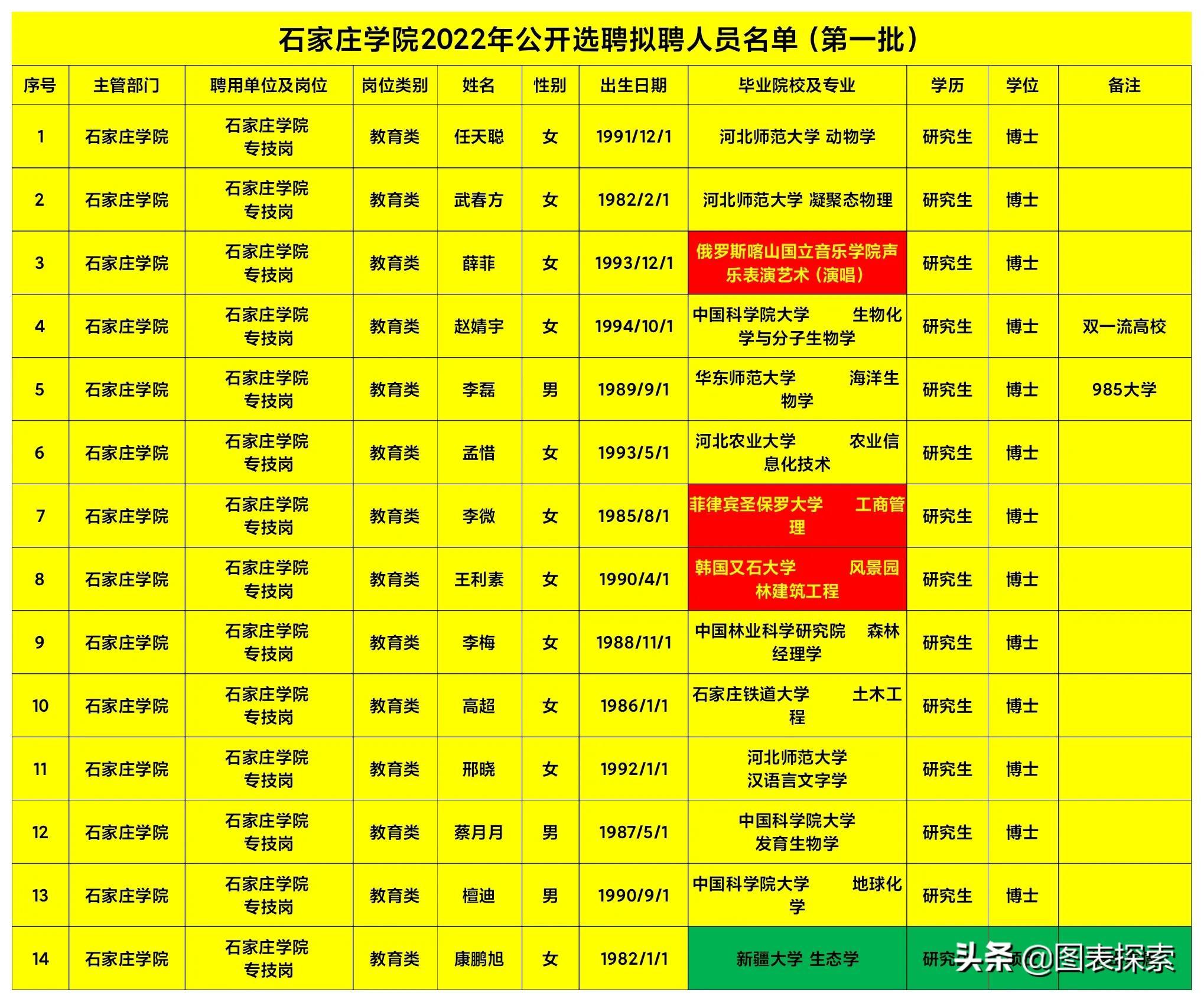这份名单是石家庄2022年公开选聘拟聘人员名单(第1批),包括13位博士以及1位硕士。这位硕士其实是属于博士家属,通过相关程序进入名单的,这个属于正常情况,并且这名硕士也是属于211大学新疆大学的。 但是其余13位正规程序选聘的博士仅有1人来自于985大学华东师范大学 ;另外有3人来自于双一流高校中国科学院大学,虽然说中国科学院大学并不是985大学,但是按照相关的学科评估,是和清北复交一个层次的,等同于顶级的985大学!