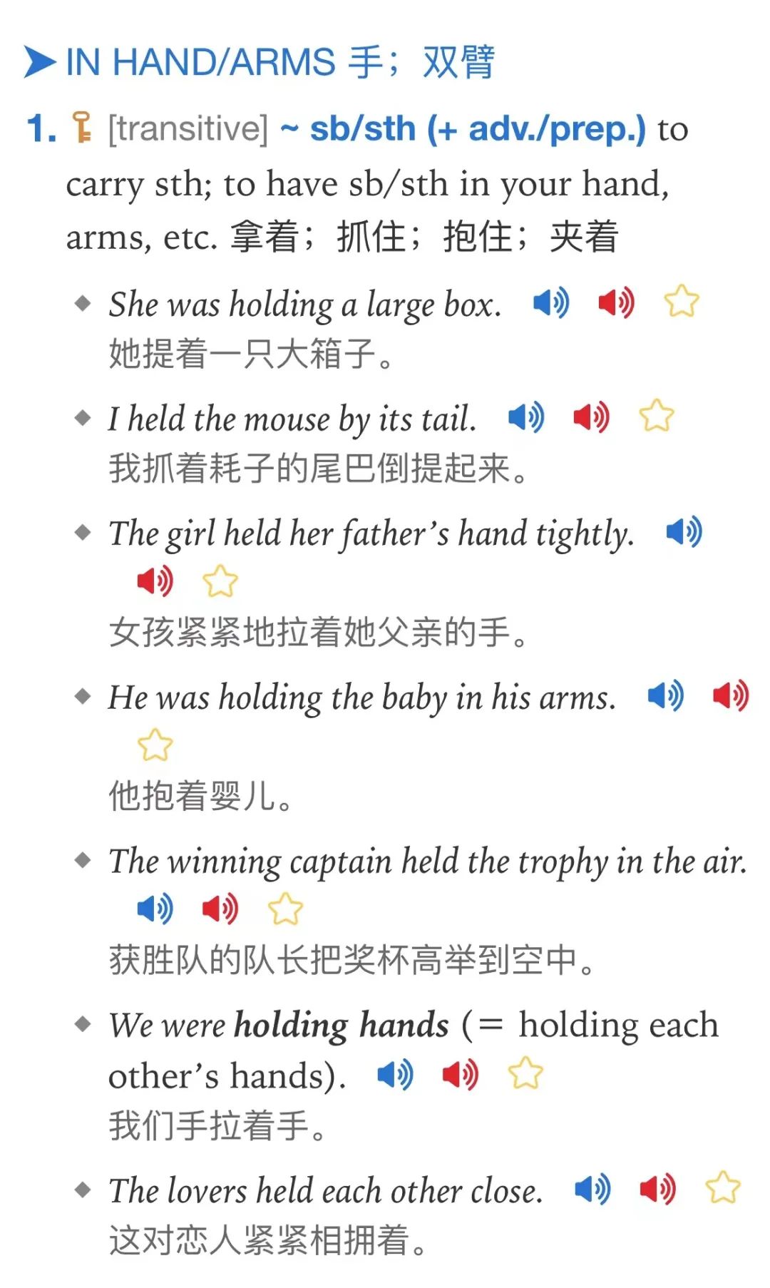 汉语翻译“拿着;抓着;抱着;夹着”也知道这几个含义区别很大,所以牛建词典里用分号隔开了,但仍然是放在了同一个释义里: