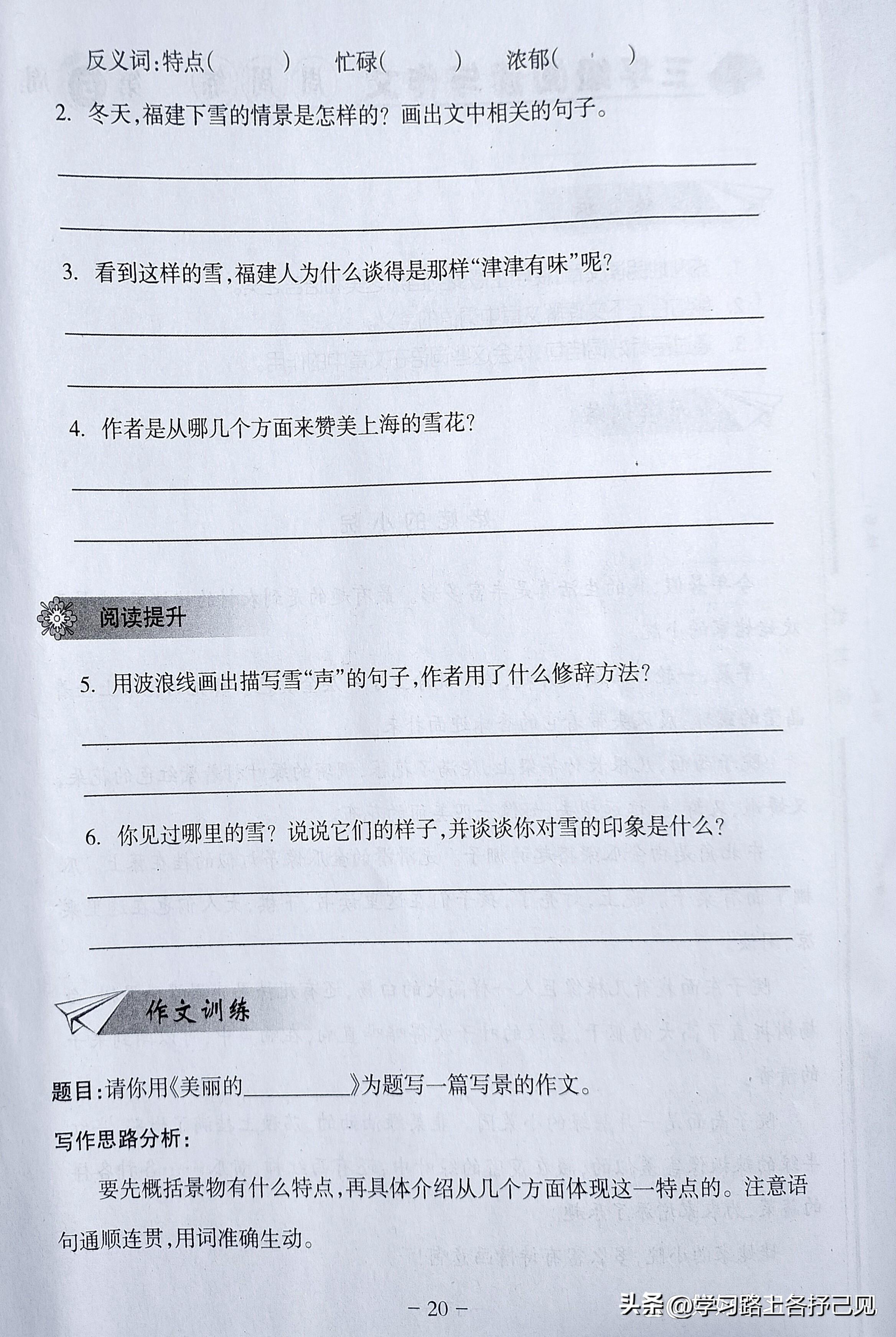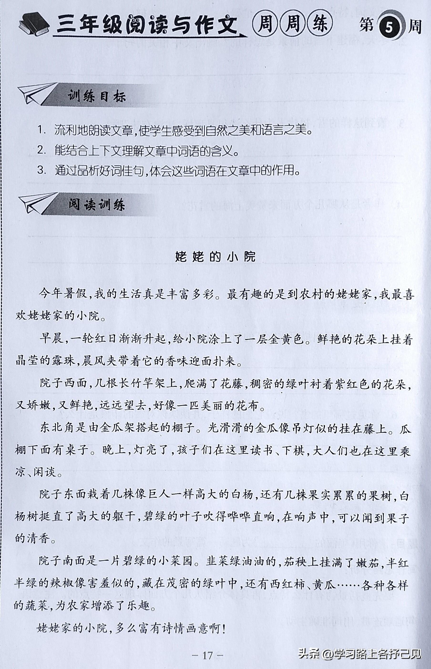6“我最喜欢姥姥家的小院。”开头写了这句话,然后按照空间顺序全面描写了小院的景色,如“院子西面、东北角”等表示方向位置的词。