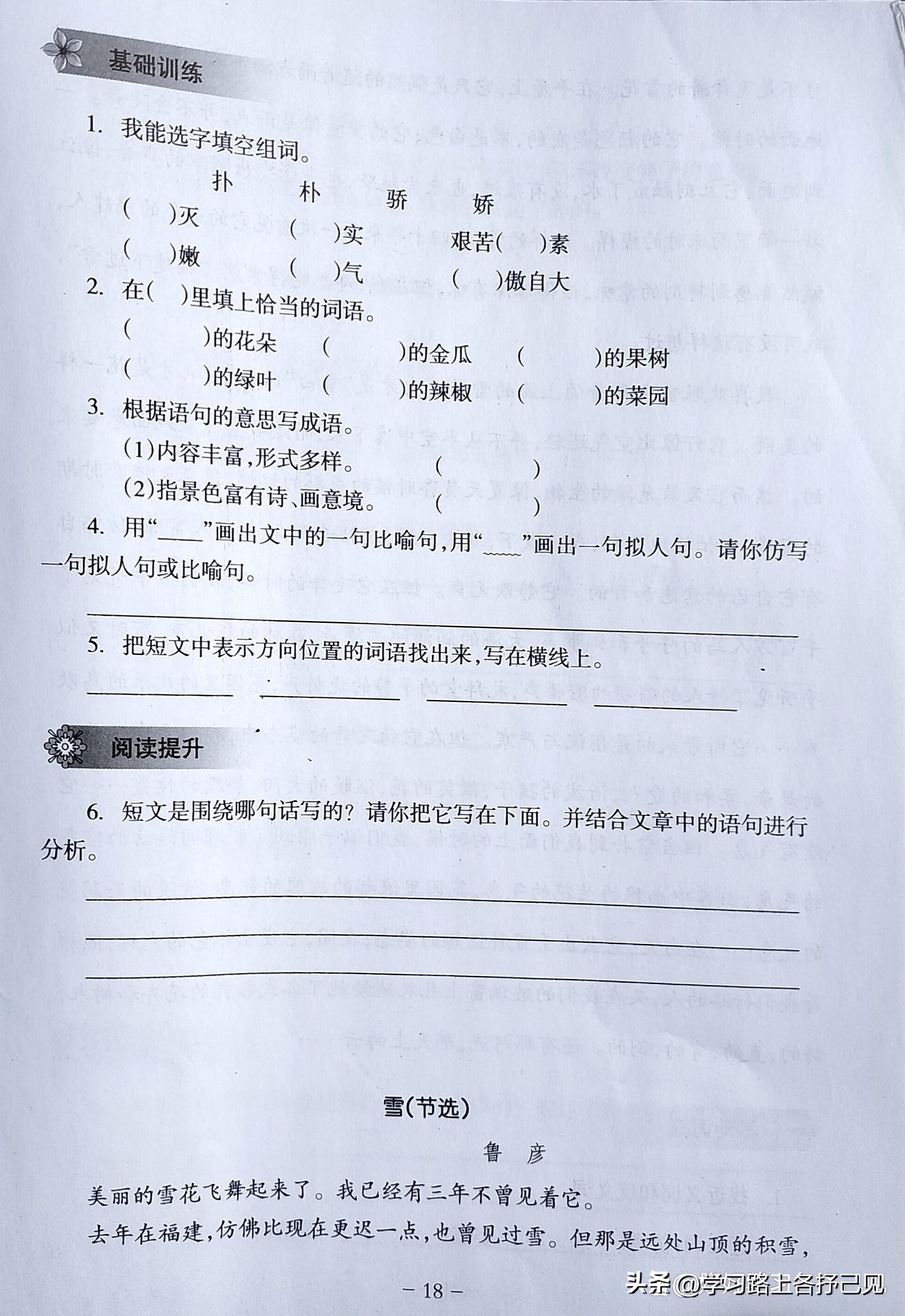 2、此题考查对词语搭配的了解。可以从短文中找到答案。题目并未指定按短文内容填写,故此题答案并不唯一。参考答案:鲜艳的花朵 稠密的绿叶 光滑滑的金瓜 半红半绿的辣椒 果实累累的果树 碧绿的菜园.