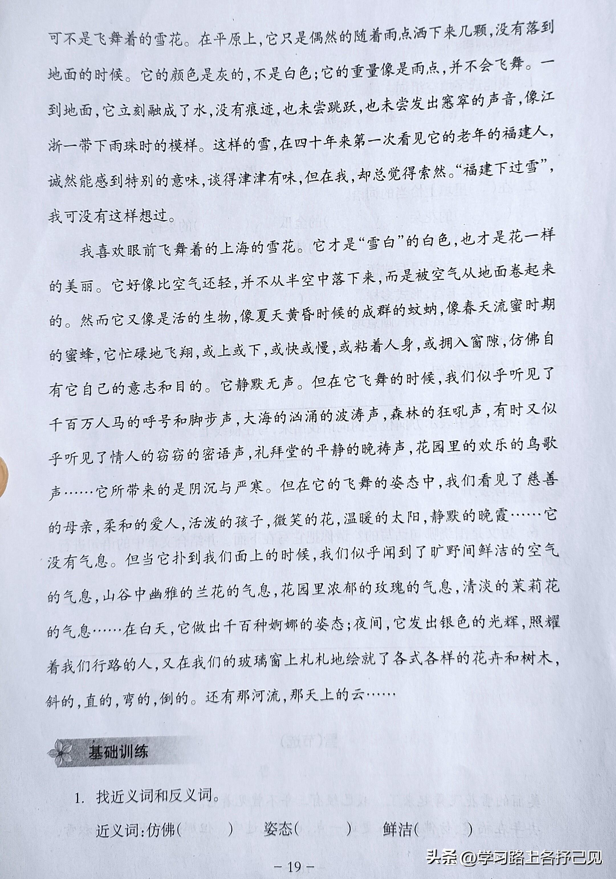 4.(1)色。白色,花一样美丽。(2)重量。比空气还轻,被空气从地面卷起来.....(3)声音。它静默无声,但在飞舞时…(4)温度。它带着阴沉与严寒。(5)气息。没有气息,但扑在脸上时…(6)姿态。白天,婀娜多