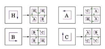 如果使用字母的一种语法表示 (Lindenmayer系统,简称L-系统) ,则可能更为容易理解和记住迭代的法则:例如,在图15中,第1次迭代后得到的图形就是图16中的H 图形;把H变成箭头右方的4小块
