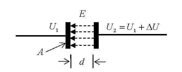 分形在工程技术中的众多应用反过来向数学提出了诸多新的问题和挑战。以上面谈及的分形电容器为例,在大学普通物理中介绍过如何来计算简单平板电容器的电容量:如图23 所示,假设两个相距为 d (单位:米 ) 的同质电极的面积均为A (单位:平方米) 。在电压差ΔU (单位:伏特) 的作用下产生电场 E =ΔU / d (单位:伏特/米) 。这时,电容器的电容量C (单位:法拉) 及其存储的电能量J (单位:度) 由下面两式给出: