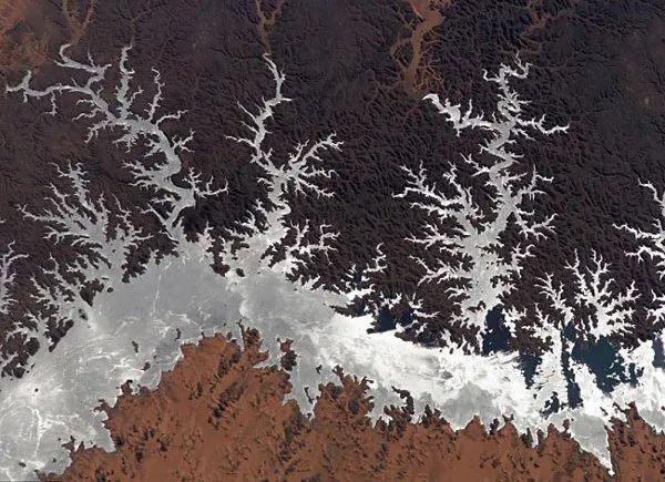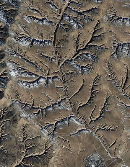 图21 是2005年美国宇航局从国际空间站拍摄到的埃及境内纳塞尔湖的照片,上面呈现出来纳塞尔湖的水流分支就有很明显的分形结构。另一幅对我国黄土高原中部山西省岢岚县所拍摄到的照片 (图22) 也有明显的分形结构。