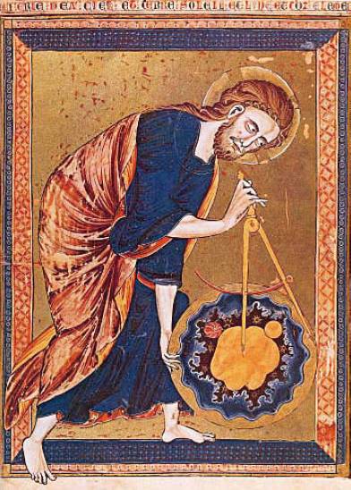 其实,类似于分形几何的历史思想还可以往前追溯。不妨看一看图2。“我在看一本科学史书时注意到了这幅图。书上说这是中世纪、即13世纪期《圣经》中的一幅插图。意思是,上帝按照几何学设计了这个世界。我又搜索了一下这幅图;一些网站显示为《上帝计测宇宙》,描绘了作为宇宙建筑者的神 (1250年绘制) 。”2008年,时为上海交通大学数学系本科生的王雄同学在给我的电子邮件中如是说。他惊叹道,“那幅图的几何,很像一个曼德波罗分形图案!作为中世纪作品画成这样的效果,已经是非常不错了,很难想象会是别的什么”。王雄后来成了我的博士研究生,现在就读于香港城市大学,研究与分形相关的混沌理论。