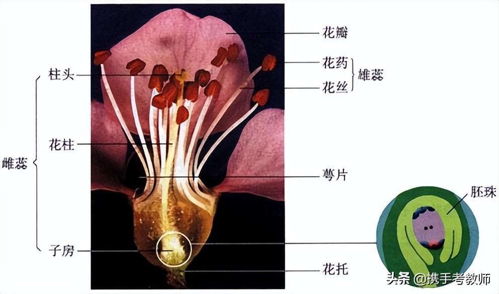 花蕊分为雌蕊与雄蕊。雌蕊包含柱头、花柱和子房。雄蕊包含花药和花丝。