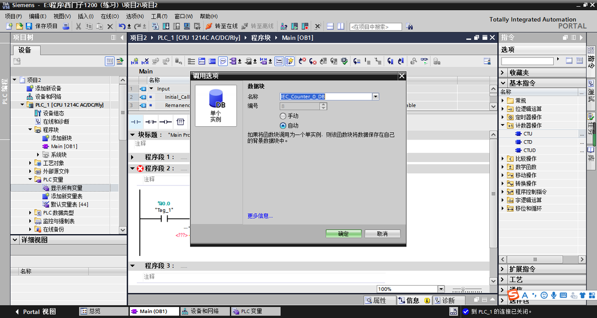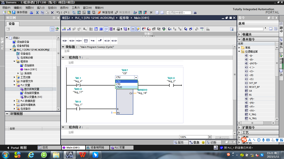 在西门子S7-1200PLC中,常用的计数器有三个类型:加计数器(CTU)、减计数器(CTD)和加减计数器(CTUD)。我们可以在“基本指令”的“计数器操作”中找到我们要用的计数器。