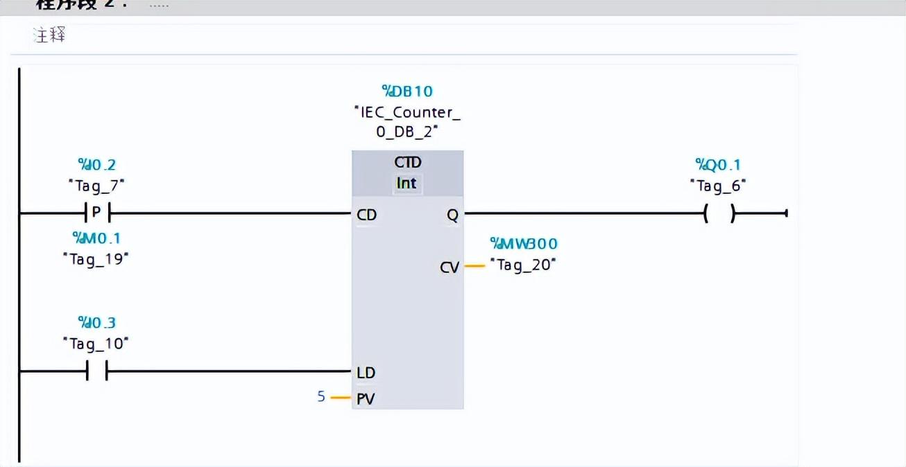 第二个程序是使用“CTD”:当PLC运行时,Q0.1直接输出,当LD条件满足时,Q0.1停止输出,I0.2条件满足次数和PV值一样时,Q0.1输出。