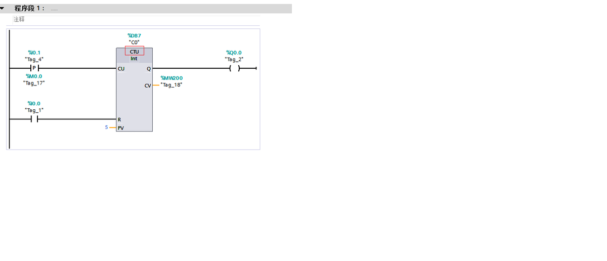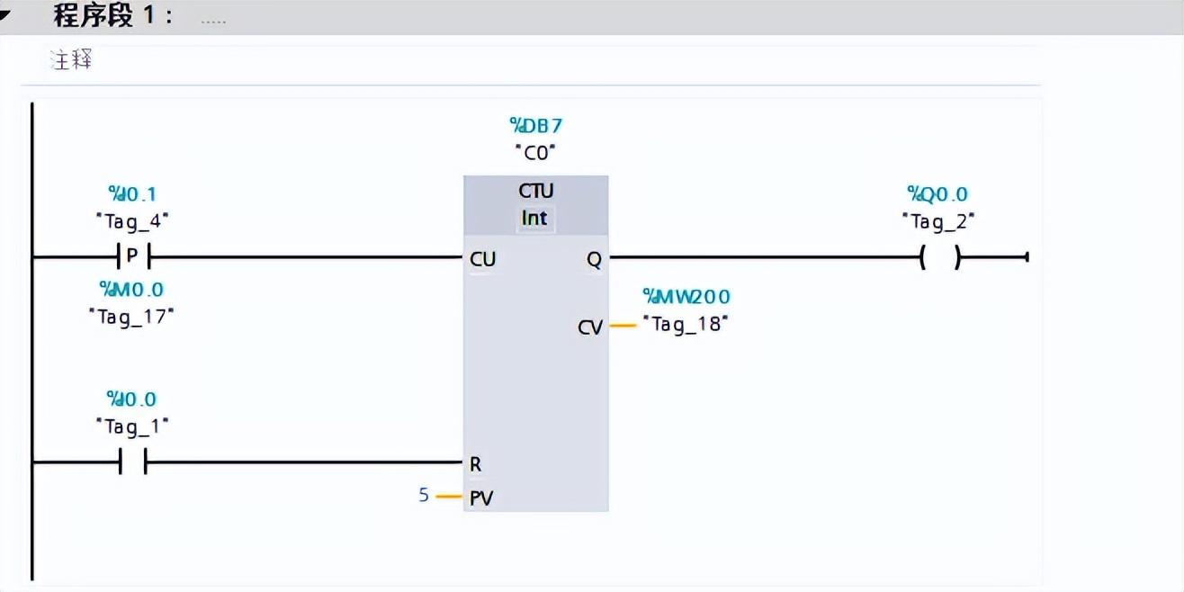 第一个程序是使用“CTU”:当I0.1条件满足次数和PV值一样时,Q0.0会输出,I0.0条件满足时,Q0.0停止输出。