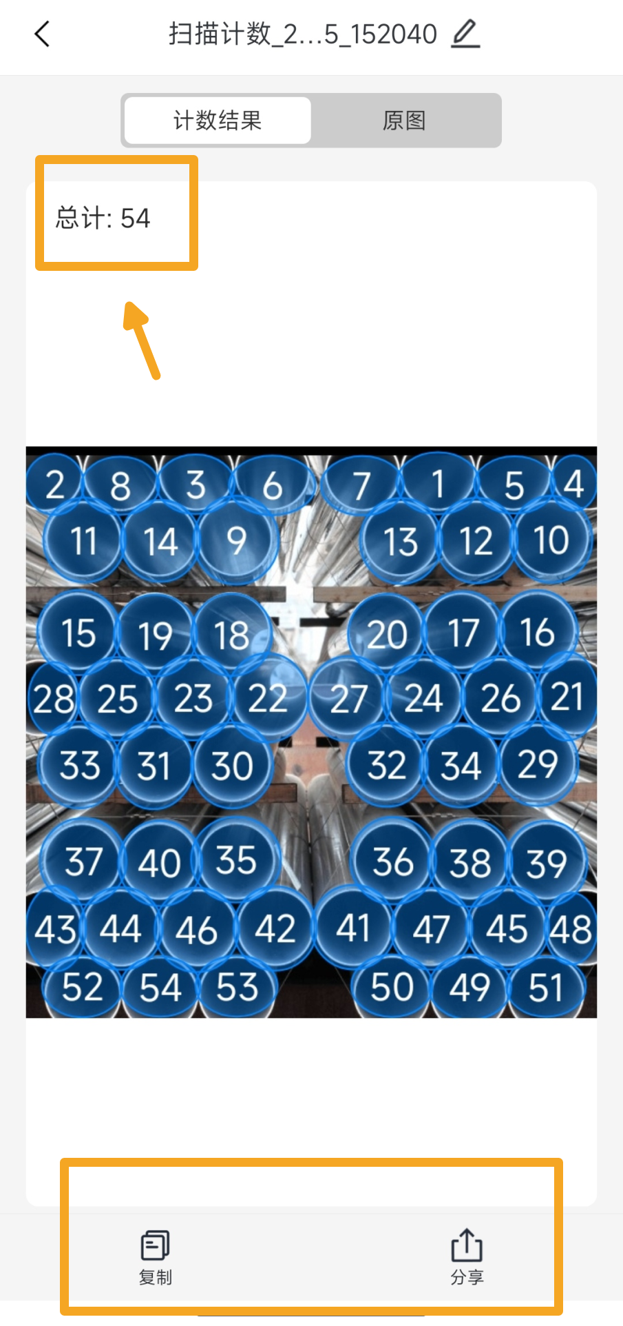 系统快速扫描计数,在 左上方显示计数总数 ;可查看计数结果和原图对比;下方 支持一键复制结果和分享 ,快速方便,准确率也很高: