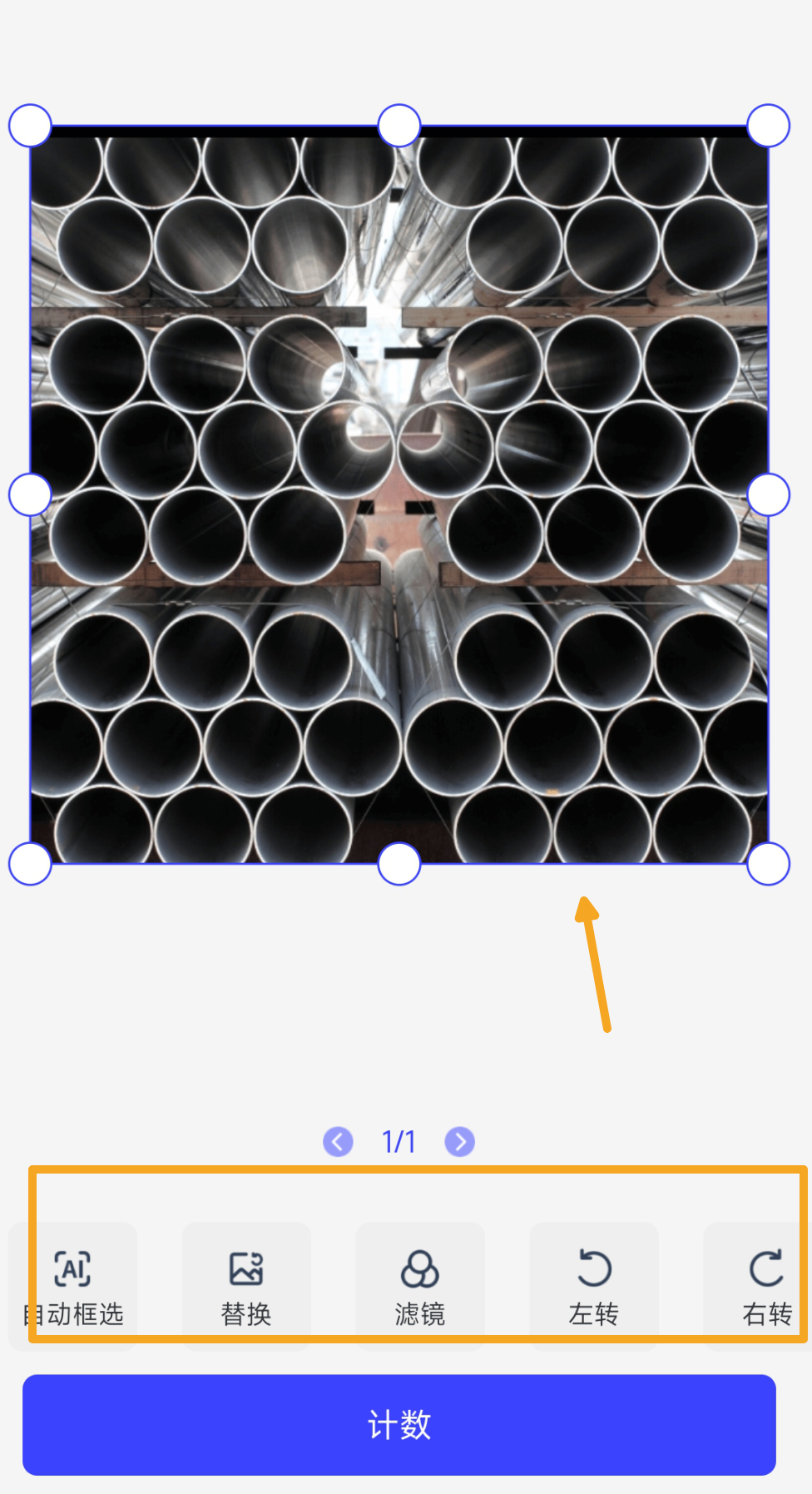 拖动选框或者系统自动识别, 确定扫描计数范围 ;支持替换图片、添加滤镜、左转或右转调整以确保快速识别: