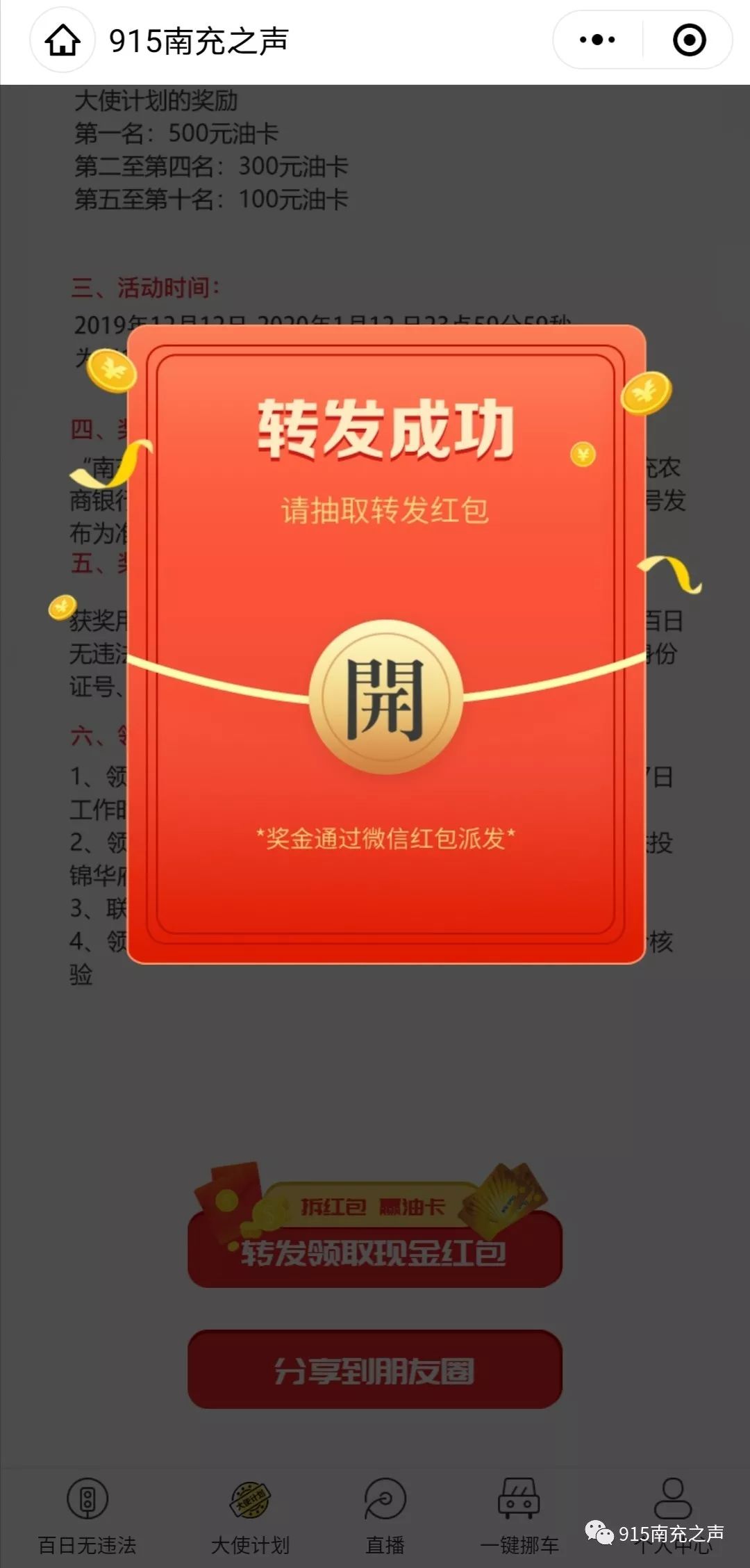 A、第一轮抽奖:抽取100名 100元油卡,价值5万的豪礼奖励(无违章期间段:2020年-1月10日-2020年2月8日。