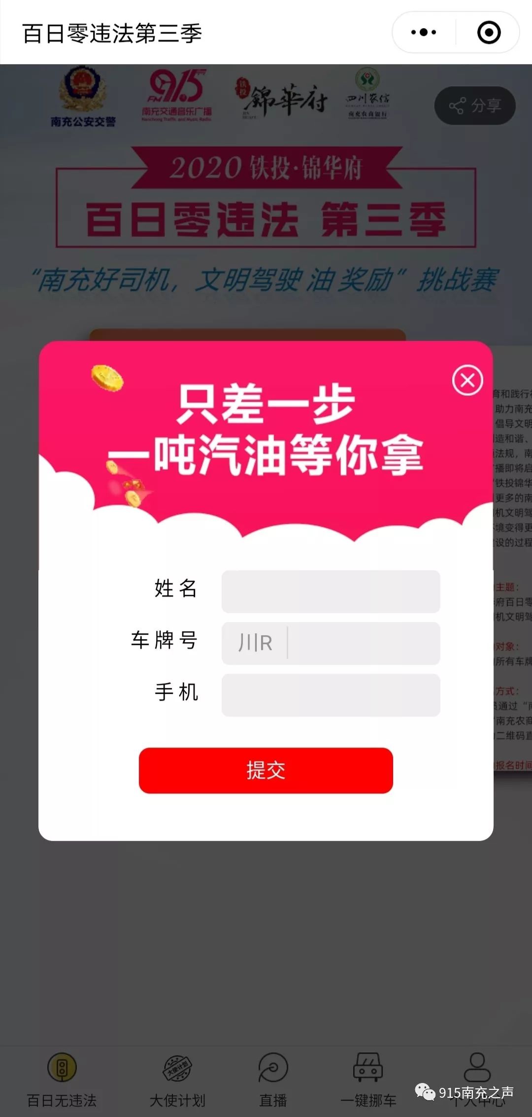参与人员通过 微信 公众号 “南充公安交警”“915南充之声”“铁投锦华府”“南充农商银行” 菜单栏进行报名,也可通过识别活动二维码直接参与活动。