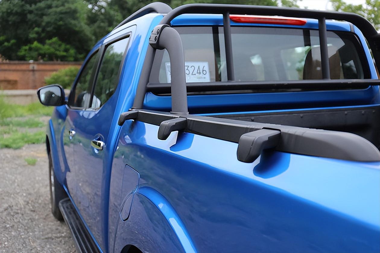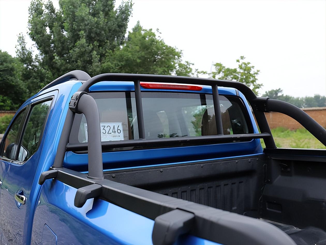 锐骐6平底货箱的设计更注重日常生活化,除了车顶提供了行李架外,尾部货箱也没有安装体型夸张的龙门架,而是采用了黑色涂装的框架来提供相应的功能用途,还能很好地保证日常用车的美观效果。