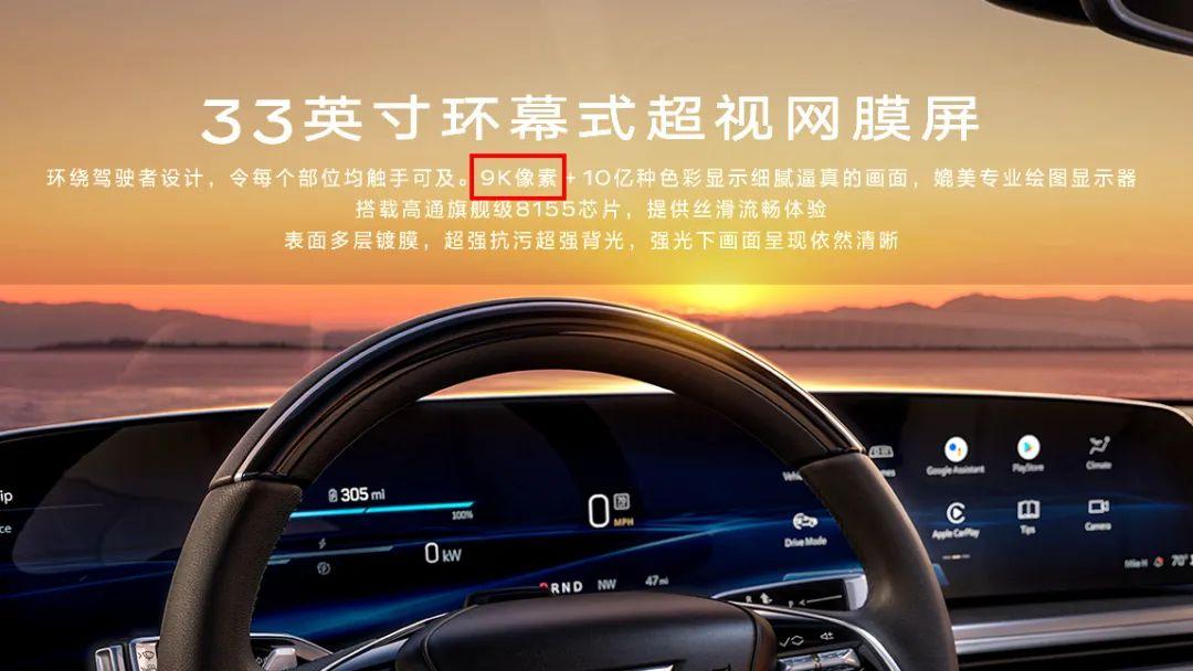 在凯迪拉克中国官网的介绍页面我们可以看到,官方宣称LYRIQ搭载的是一块“ 33英寸环幕式超视网膜屏 ”,并且有“ 9K分辨率 ”。