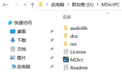 官网在MDict | One app for all dictionaries ( https://www.mdict.cn/ ),选择PC 2.0.10 版本。此软件是绿色免安装版本,解压缩,即安装成功,如图所示,有三个文件夹 audiolib, doc, res和一个 .exe文件。.exe文件双击打开,即可运行词典。