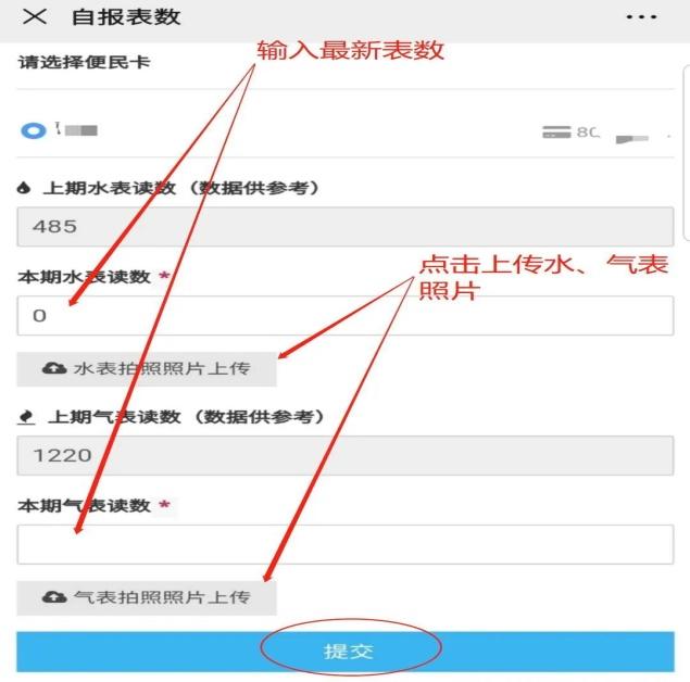 自报表数页面会显示上期燃气表和水表的历史指针数,手动输入最新的燃气表和水表读数(必填),并将水表和燃气表的表数拍照上传(可选)后点击提交