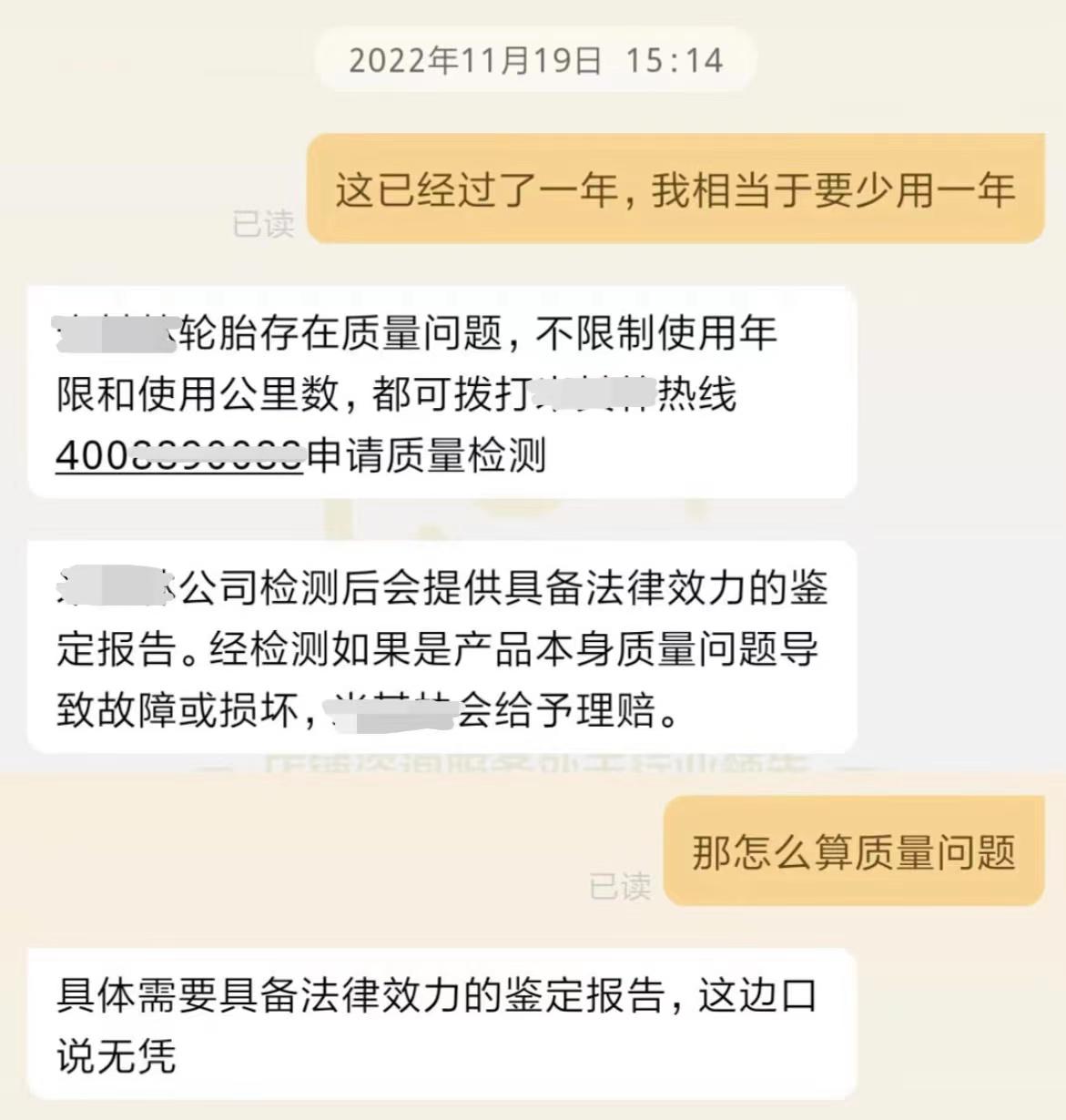 林先生:就相当于我少用一年嘛,售后那头说他们的这个轮胎是没有日期超过多长时间的这个说法,终身质保就是有问题你再找他们。