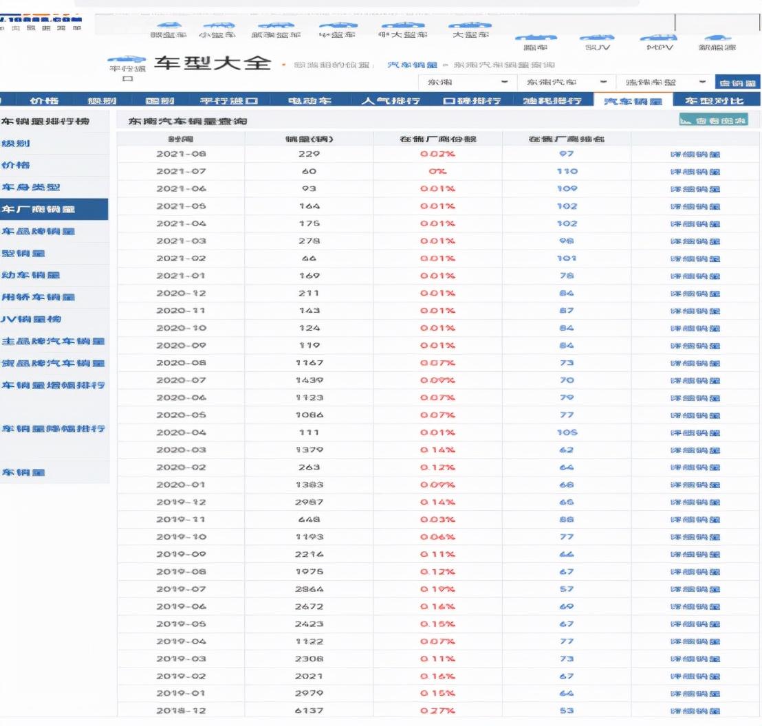 从2015年开始,东南汽车的销量也从巅峰时期的12658辆(2015年12月份),在售厂商份额0.49%。 到如今的60辆(2021年7月份),在售厂商份额也仅有0%。两组数据相比,差距也显而易见。