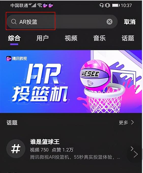操作方法如下:进入腾讯微视 APP,搜索「AR 投篮」。