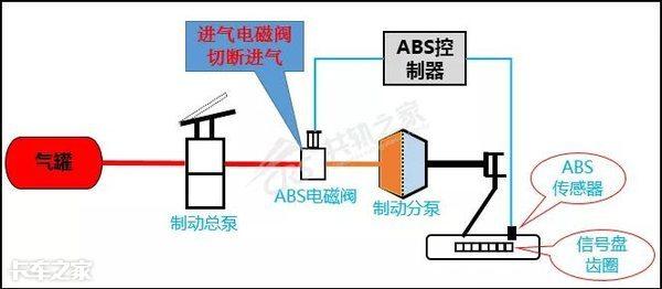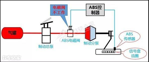 第二步: 当驾驶员在跑车途中踩刹车时,储气罐的压缩空气经过制动总泵来到ABS电磁阀,然后进入制动分泵对车轮进行制动。此时ABS系统在“装死”,控制器不控制ABS电磁阀工作。这一阶段就相当于以前机械式刹车系统。