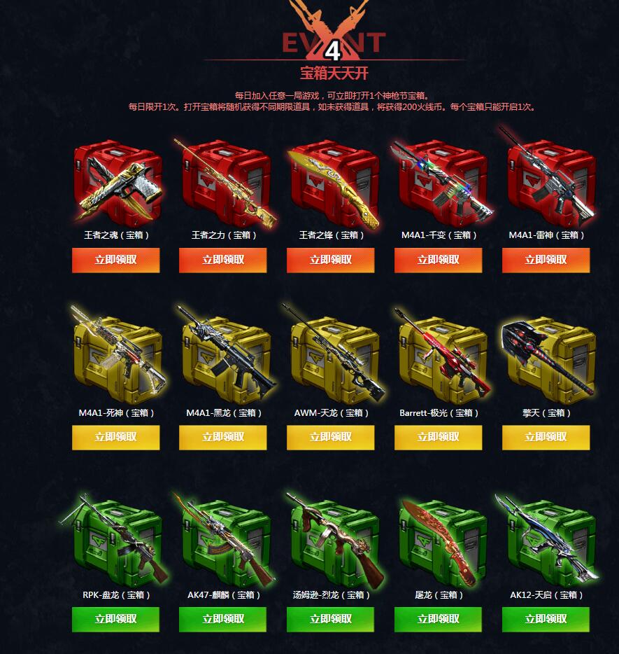 宝箱天天开,每天加入游戏,就可以立即打开一个神枪节宝箱,内置不同期限道具。
