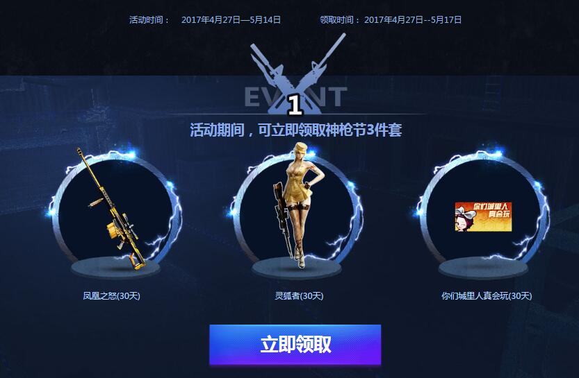 5月1日加入任意一局游戏,可从英雄级武器中选择3个领取。有M4A1-死神、黑武士、烈龙、沙鹰、麒麟刺可供选择。