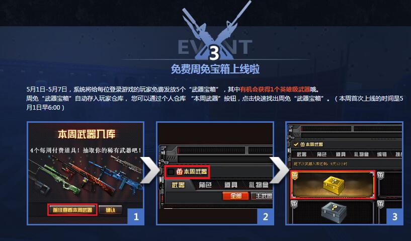 免费周免宝箱上线,5月1日-5月7日,系统将给每位登录游戏的玩家免费发放五个“武器宝箱”其中有机会获得1个英雄级武器哦。