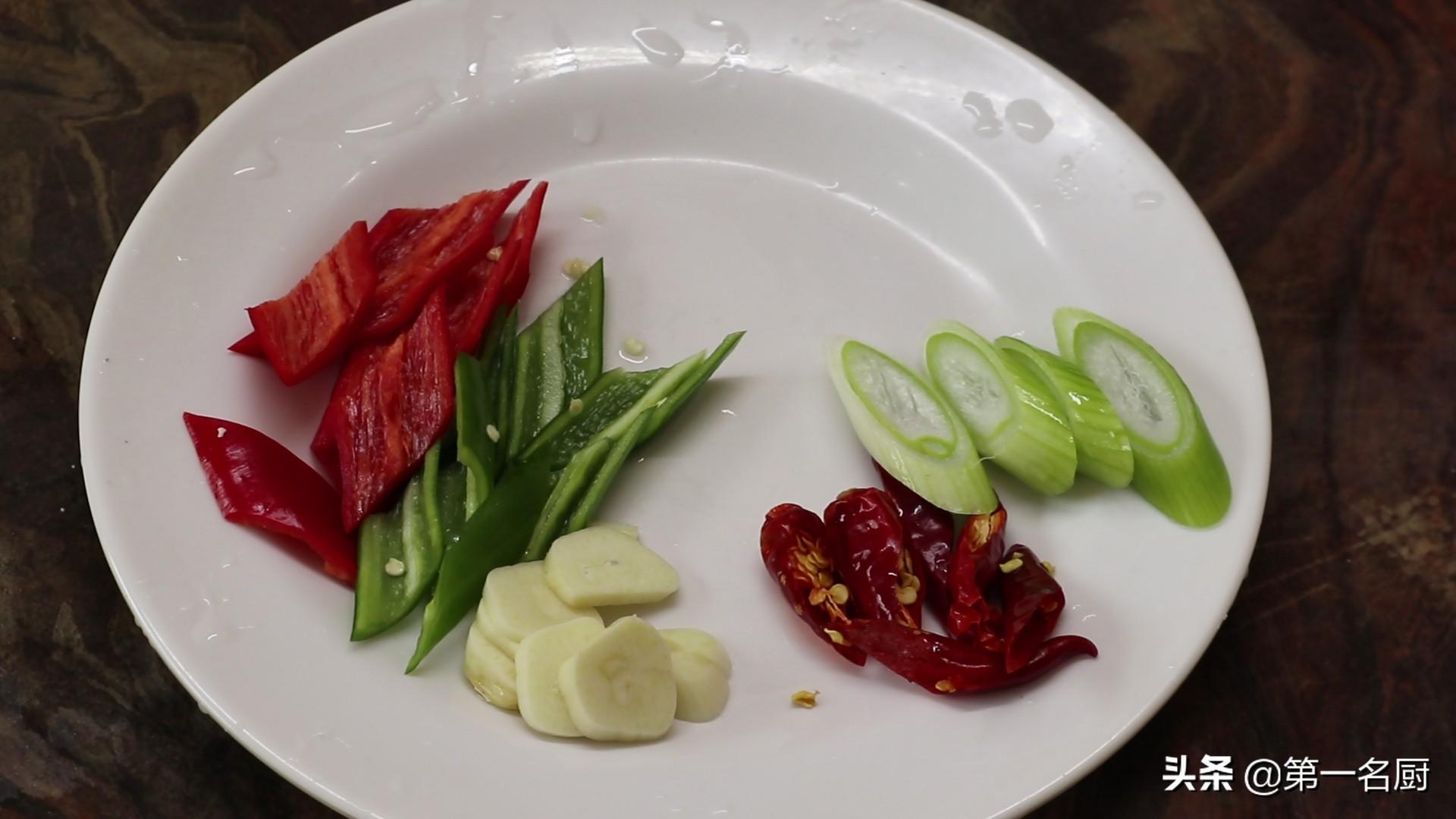 2.这道菜用到的辅料有,青红椒,蒜片,红干椒,葱片各适量。