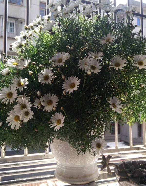 白晶菊喜光,一盆适合栽种一棵,生长期补充氮磷钾肥,花期补充磷钾肥,可从冬末一直开到第二年初夏,花期超级长。