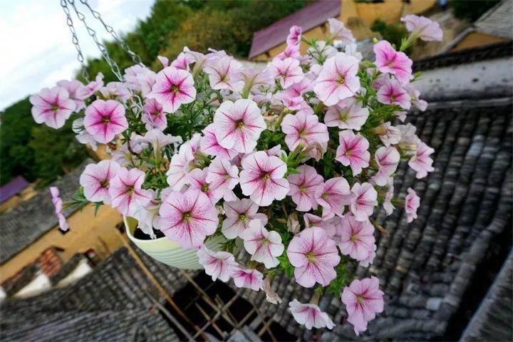 小苗长出真叶后分苗,10~15cm口径的花盆留一株矮牵牛,全日光养护,枝条每长6cm就摘心一次,直到剪成大花球。