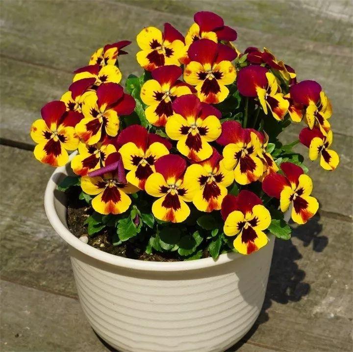 三色堇的颜色丰富,一盆可种多棵,全日光养护,喜凉爽环境,能耐短期-15℃的低温,无需修剪,播后3个月开花。