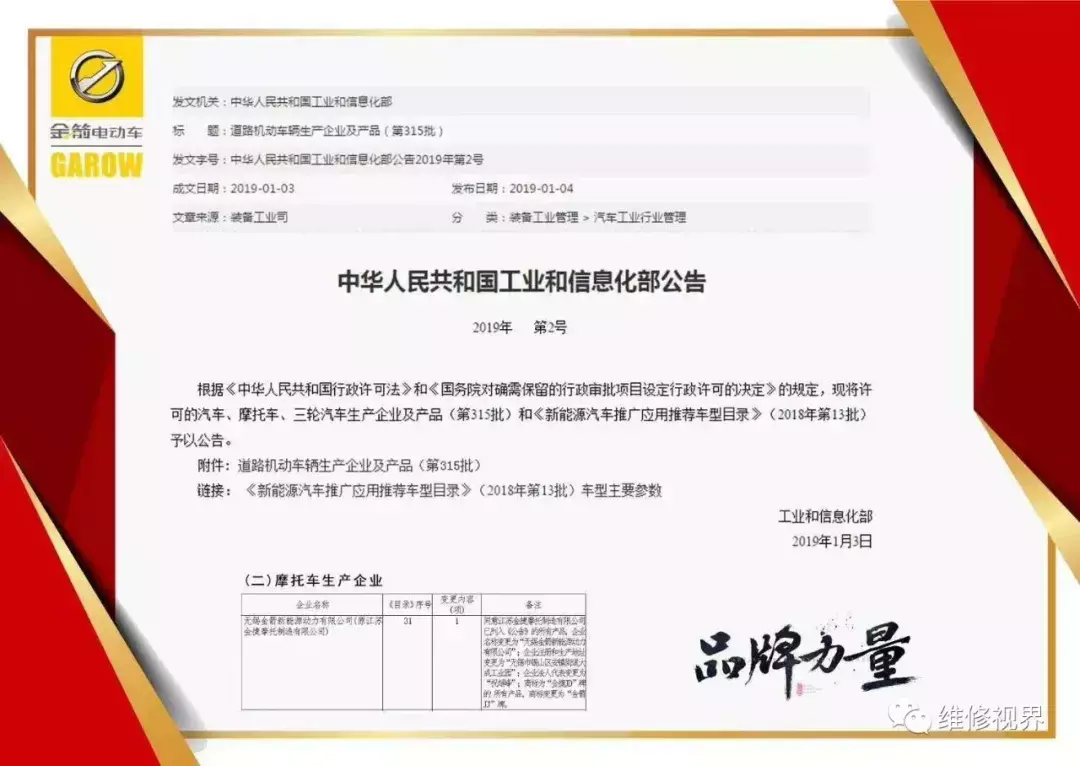 工信部权威发布,金箭公司、金箭牌、电动摩托车资质正式公告成