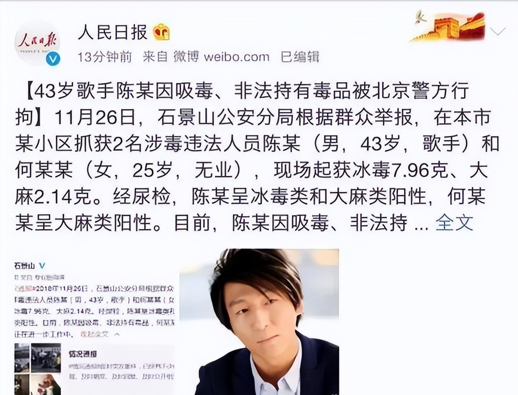 陈羽凡因吸毒被抓,和他一起被抓的还有一个陪吸的妹子,