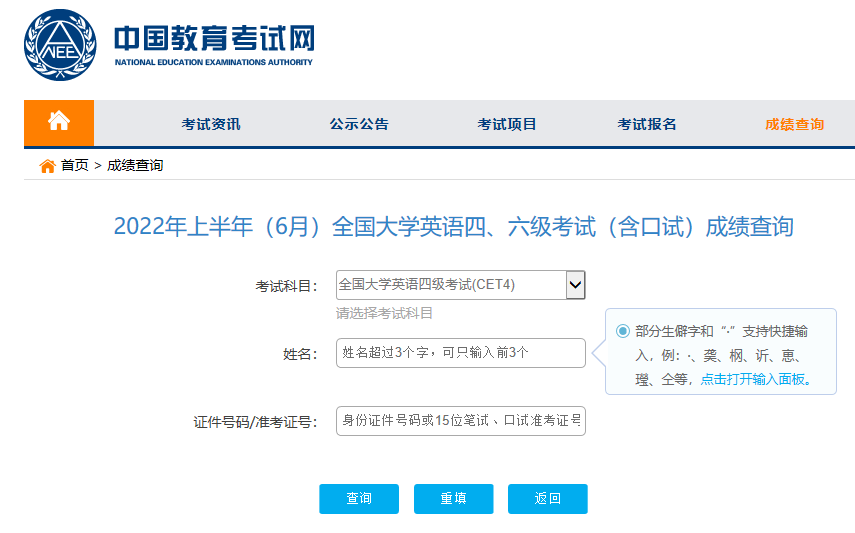2、输入姓名和证件号码/准考证号,点击查询按钮进行查询。