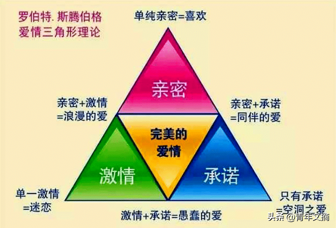 关于爱情,心理学家斯滕伯格提出了一个著名的“爱情三角理论”,即爱情由三个基本成分组成: 激情、亲密和承诺。