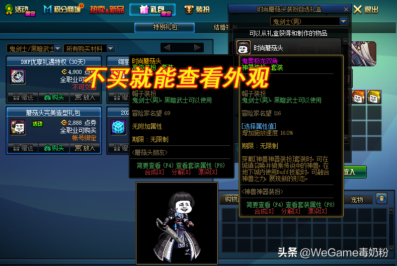 比如dnf在3.24更新后上架的“蘑菇头礼包”,又或者是春节套,勇士们如果不看官网更新的话, 很难知道礼盒里面有具体什么道具,还有时装穿上之后是什么样的外观!所以大家经常会后悔, 比如蘑菇头时装,买了之后发现与身上的时装不搭啊,很后悔,而这一篇就让你摆脱这个烦恼。为何之前没写,以前我以为大家都会,但没想到多数勇士都不知道……