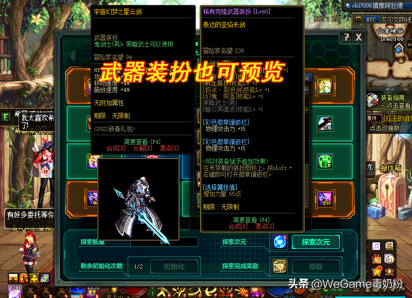 举一反三,不仅是时装可预览!蘑菇头的武器装扮也可行 , 甚至能衍生到一切活动!包括战令礼盒、活动道具、装备礼盒…… 就连“探索:次元雷达”的奖励界面也可行,比如“新春至尊装扮礼盒”,可以查看其中的“至尊武器(宇宙幻梦之星云剑)”的外观。还有时装附带的皮肤属性,可以很清楚看到皮肤自带6点所有属强和2个徽章镶嵌栏。