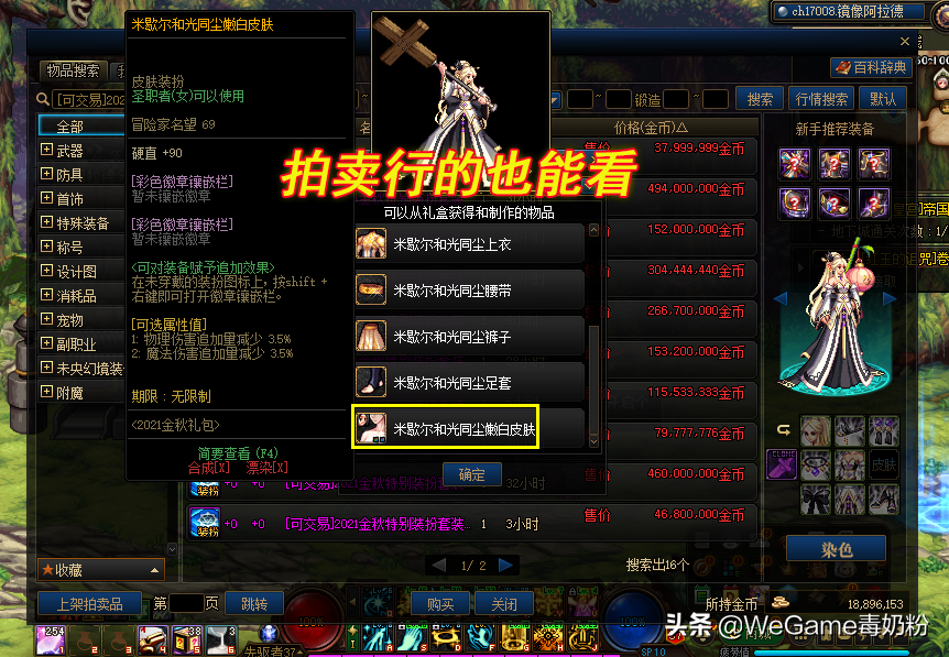 其实更加好用的方式是在拍卖行,比如21年的圣职者的至尊时装礼盒 ,直接在拍卖行预览皮肤的属性,有没有镶嵌栏一目了然,再也不用到处查资料问朋友了,同时也不会买错时装!