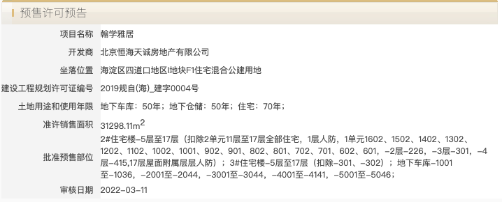 据北京市住建委官网信息显示,3月11日,天恒学院里(翰学雅居)获预售许可证预告,准销售面积为31298.11㎡。