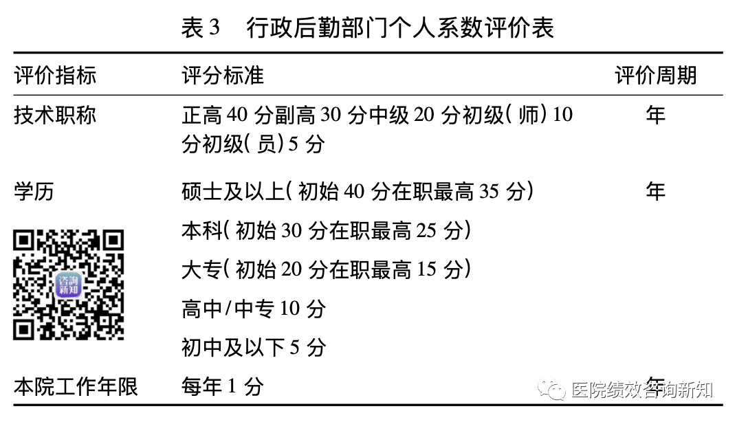根据行政后勤人员的整体结构分布,评价侧重个人能力,考虑员工对医院的忠诚度等方面因素,最终选定技术职称、学历、本院工作年限为个人系数的评价指标。每个指标设定评分标准和评价周期,每个评价周期根据评价指标的评分情况形成个人系数。需要说明的是学历指标,为了区别员工的取得学历的不同情况,对进院时的初始学历和入院后在职继续学习完成的个人最高学历分别设置不同的分数,每年评估一次,动态变化(见表3)。