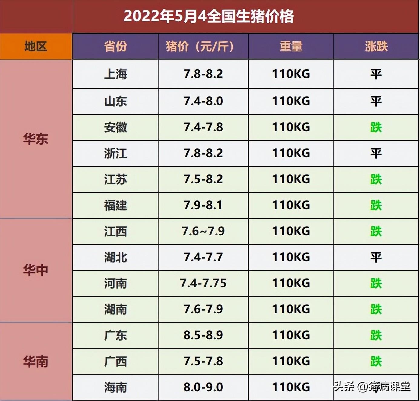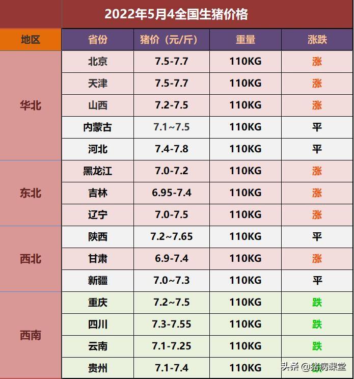 今日生猪价格最新行情: 2022年5月4星期三,农历四月初四壬寅年 虎甲辰月 丁巳日青年节;今日全国外三元生猪均价为15.50元/千克,猪价较昨日上涨0.03元/千克,环比上涨22.02%,同比下跌30.61%;内三元生猪均价15.05元/千克,价格较昨日上涨0.01元/千克;土杂猪均价为14.60元/千克,价格较昨日下跌0.01元/千克;今日全国生猪价格没能延续前两日反弹态势,仅东北、华北微涨,西南地区下跌、其他地区表现平稳。仔猪均价为24.95元/千克,较昨日上涨0.15元/千克;白条肉均价20.35元/千克,较昨日上涨0.05元/千克;全国二元能繁母猪价格为47.56元/千克;猪粮比5.38:1。