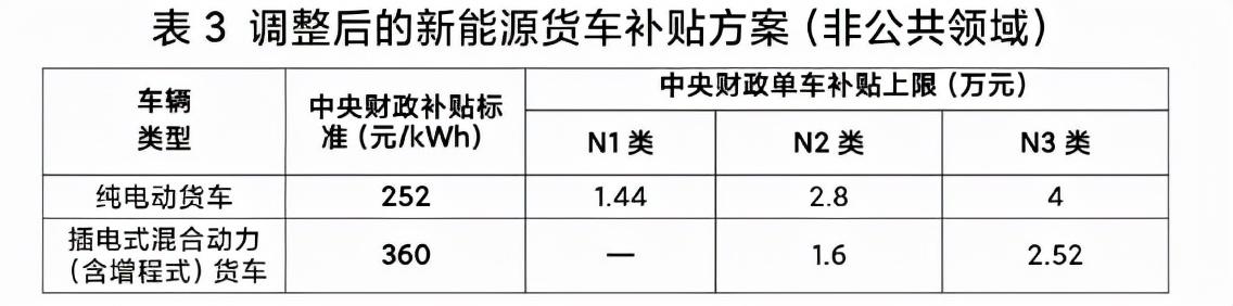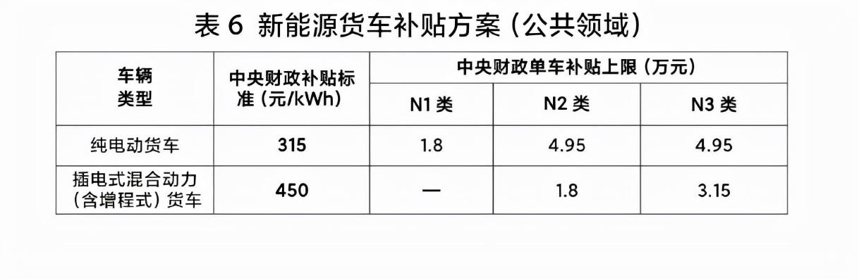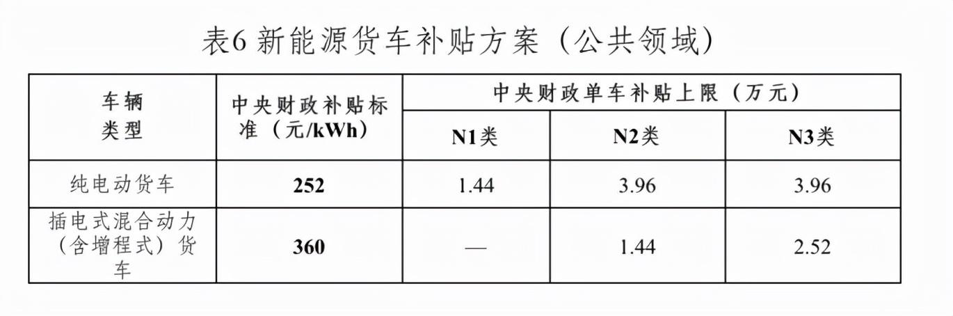 所谓公共领域,指购买的电动卡车主要用于物流配送、环卫领域等。根据四部委发布的最新《方案》,2022年公共领域电动卡车补贴每度电按252元来补贴,对N1类电动卡车最高补贴上限不能超过1.44万元;对N2类电动卡车最高补贴上限不超过3.96万元;对于对N3类电动卡车最高补贴上限也不超过3.96万元。