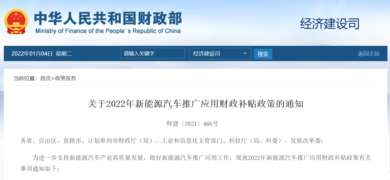 2021年12月31日,财政部、工业和信息化部、科技部、国家发展改革委四部门联合发布《关于2022年新能源汽车推广应用财政补贴政策的通知》(简称《通知》)以及《2022年新