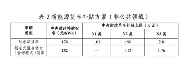 所谓非公共领域,是指购买的电动卡车主要用于私家拉货,而非公共领域的物流配送或环卫领域。根据四部委发布的最新《方案》,2022年非公共领域 的电动卡车补贴每度电按176元来补贴,对N1类电动卡车最高补贴上限不能超过1.01万元;对N2类电动卡车最高补贴上限不超过1.96万元;对于对N3类电动卡车最高补贴上限不超过2.8万元。