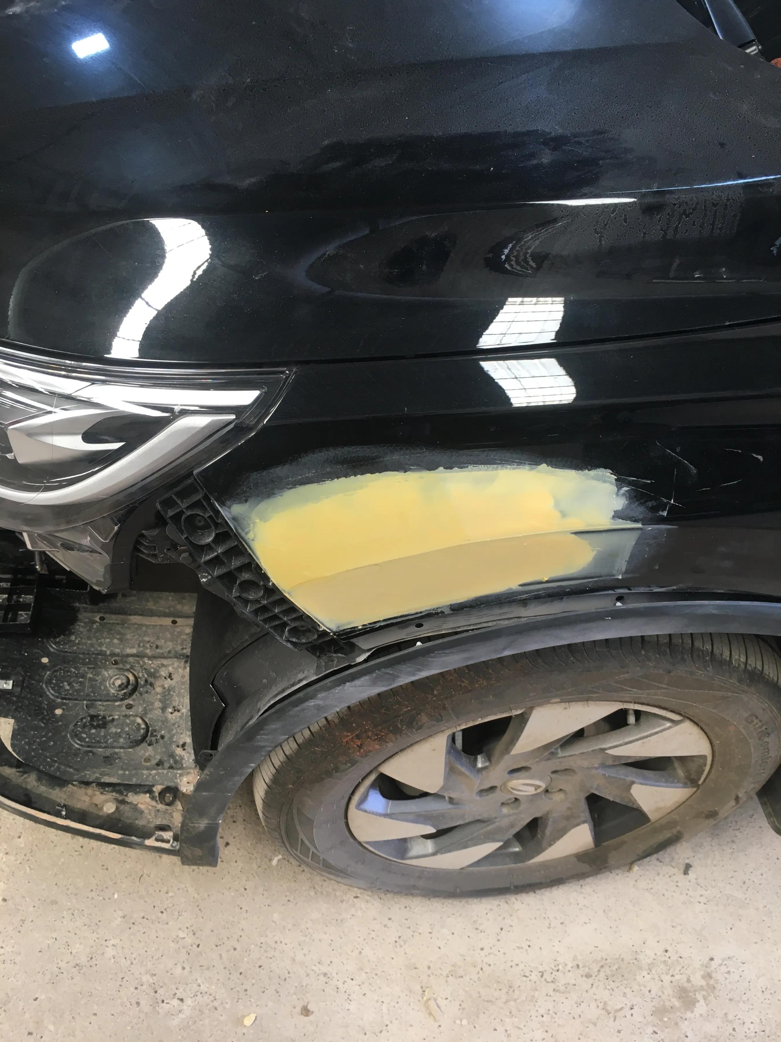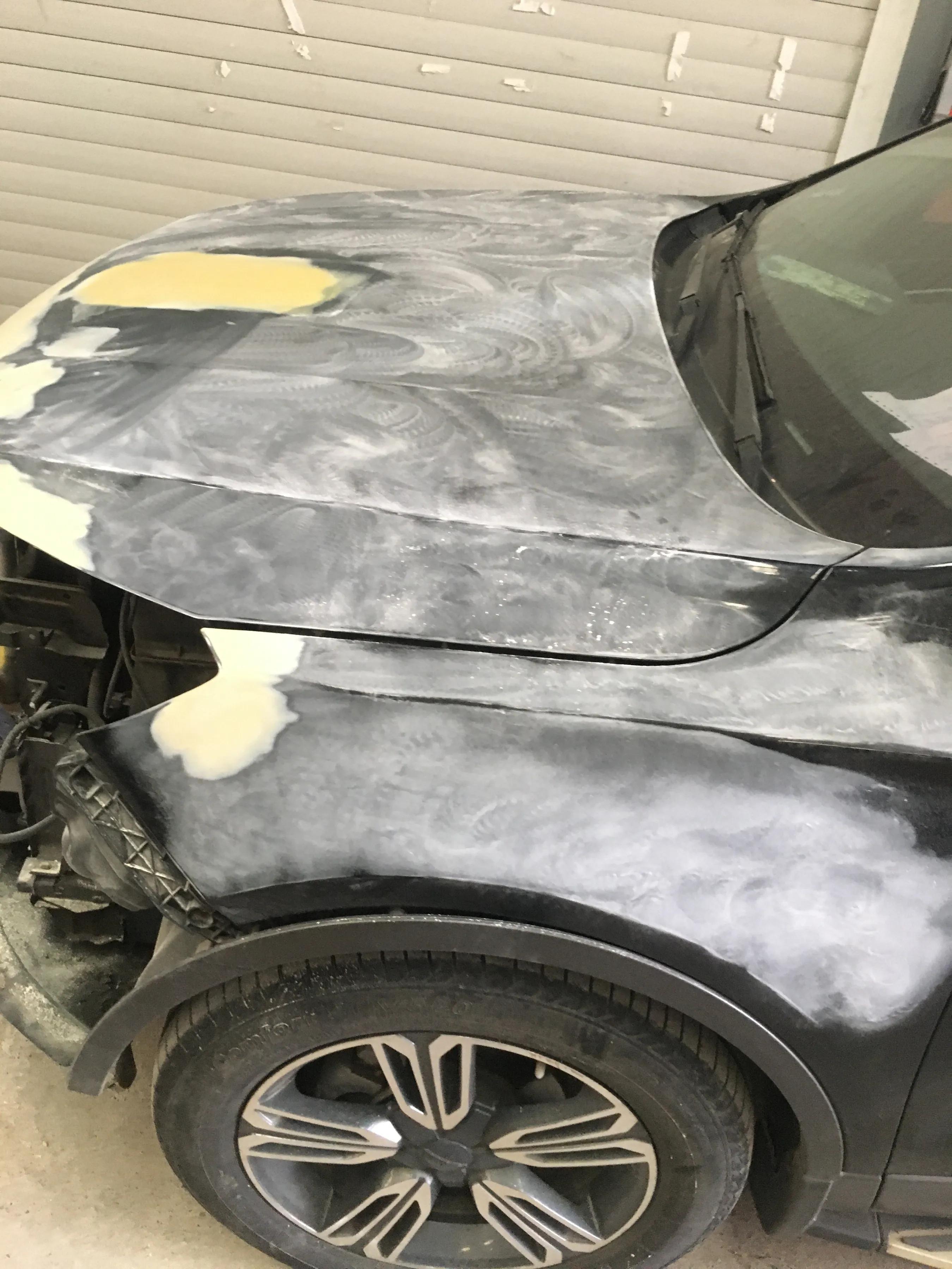 2钣金修复后或换新的钣金件后就会交给油漆师傅做底子,把钣金面搞平,有点不平的地方会刮腻子。这个过程中可让调漆师傅调漆了。