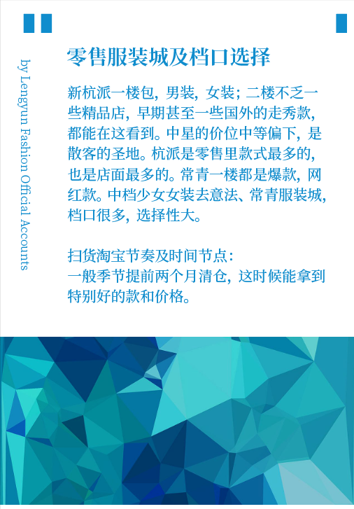 “今天我将从服装城及档口选择,拿货选款技巧与零售服装城及档口选择两个方面尽可能全面地介绍一下杭州四季青批发市场,并且整理一些自己心得的宝藏档口和尾货抢购节奏与时间节点。”